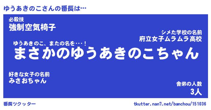 | ヒーロー風カッコイイあだ名 | 『スーパーユウアキノコ』『魔戒騎士ユウ』 |