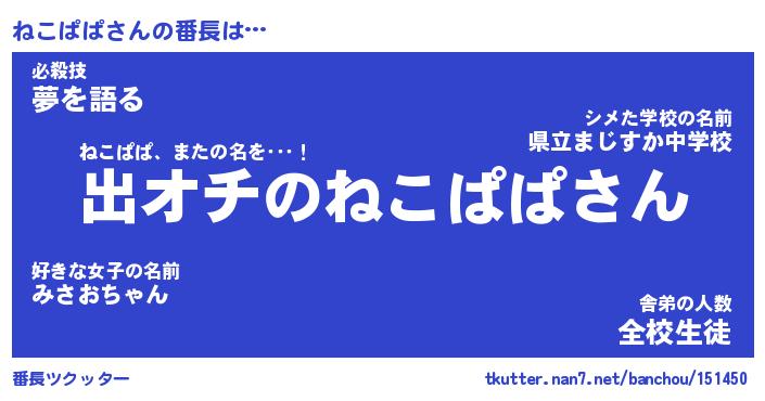 | 伝説のあだ名 | 『伝説のスナイパーねこぱぱ』 |