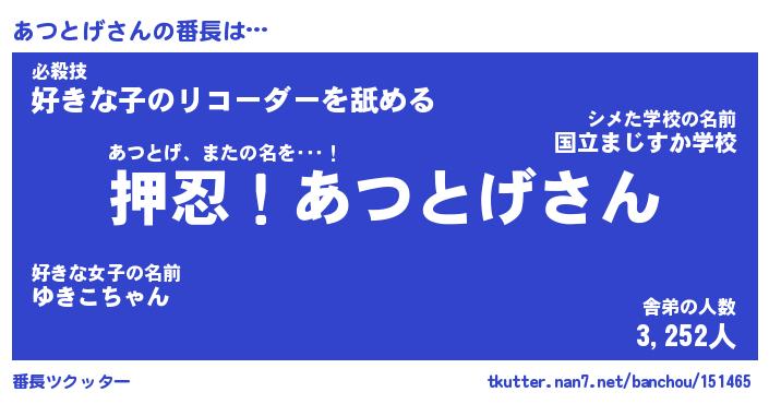 | 意味不明あだ名 | 『ペロリンあつとげ』『永久保存あつとげ』 |