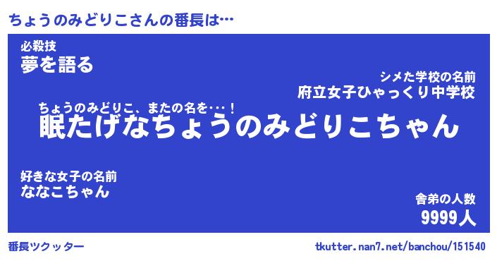 | 肩書あだ名 | 『ちょうのみどりこ店長』 |