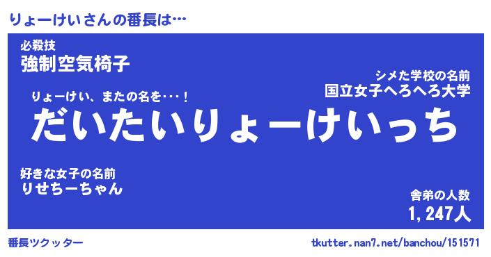 | 男性向けラノベタイトル風あだ名 | 『りょーけいの憂鬱』 |