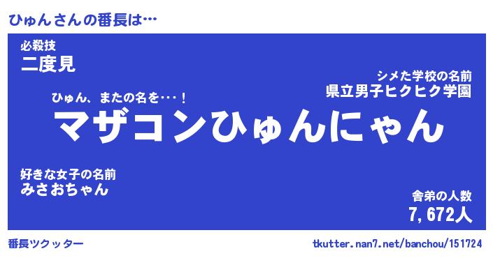 | 肩書あだ名 | 『ひゅん店長』『ひゅん総理大臣』 |