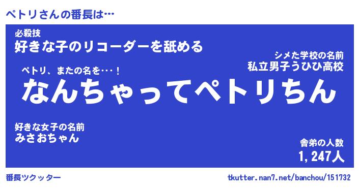| ポケモン風あだ名 | 『ペトチュウ』『ペトリダネ』 |