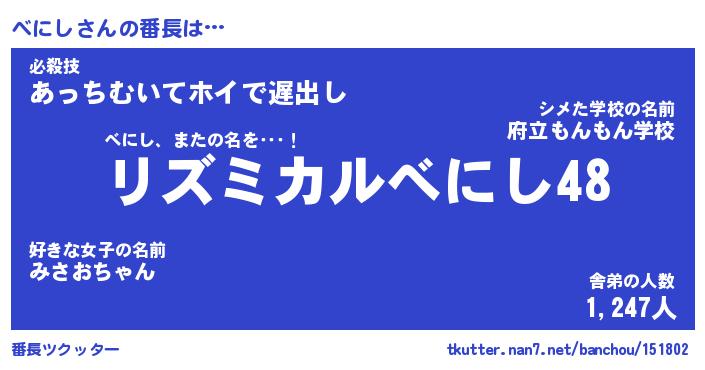 | ヒーロー風カッコイイあだ名 | 『スーパーベニシ』『ウルトラべにしマン』 |
