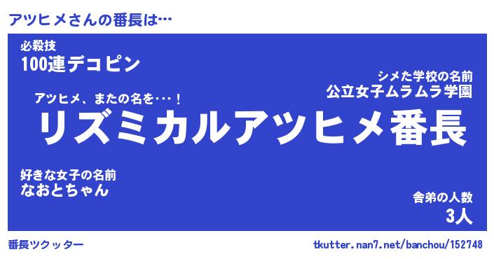 | 意味不明あだ名 | 『ペロリンアツヒメ』『永久保存アツヒメ』 |