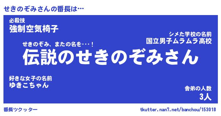 | 男性向けラノベタイトル風あだ名 | 『せきのぞみの憂鬱』 |