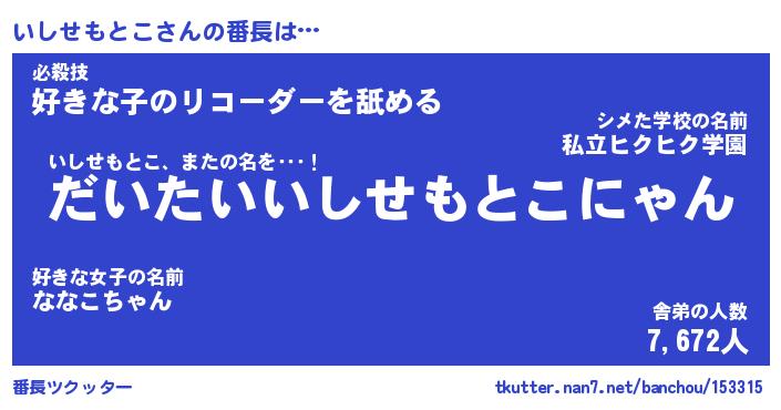| 男性向けラノベタイトル風あだ名 | 『いしせもとこの憂鬱』 |