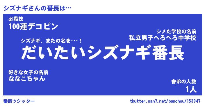 | 意味不明あだ名 | 『ペロリンシズナギ』『永久保存シズナギ』 |