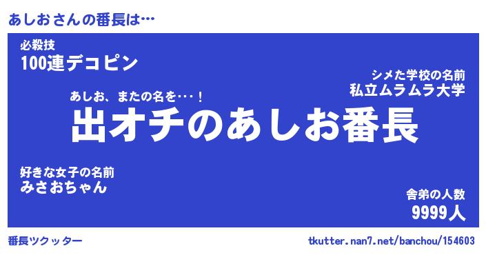 | 意味不明あだ名 | 『ペロリンあしお』『あしおフォーエバー』 |