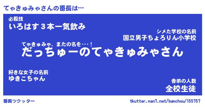 | ヒーロー風カッコイイあだ名 | 『スーパーテャキュミャ』『暗黒騎士テャ』 |