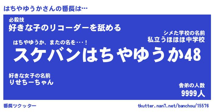 | 恥ずかしいあだ名 | 『プリティーはちやゆうか』『はちっちょ』 |