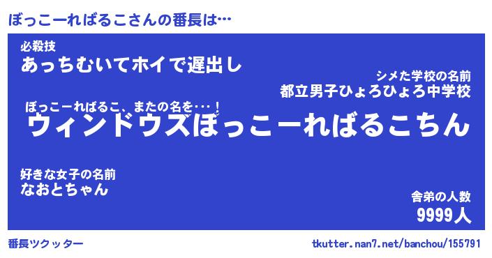 | 伝説のあだ名 | 『伝説のスナイパーぼっこーればるこ』 |