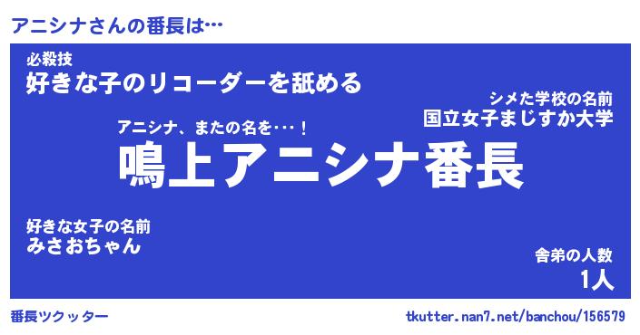 | 意味不明あだ名 | 『ペロリンアニシナ』『永久保存アニシナ』 |