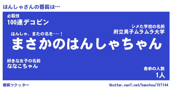 | 意味不明あだ名 | 『ペロリンはんしゃ』『永久保存はんしゃ』 |