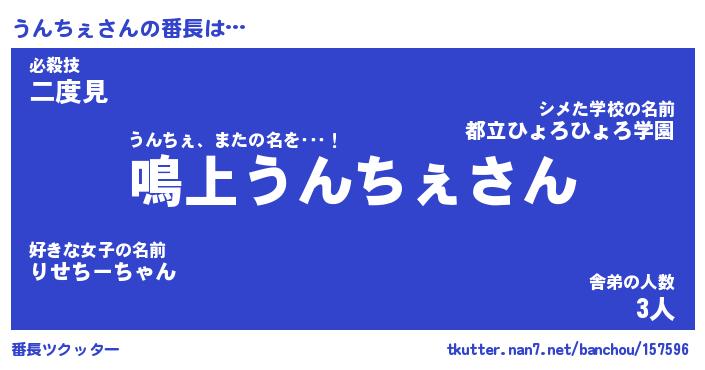 | ファンタジー風あだ名 | 『ウンフェル』『エターナルウンチェー』 |
