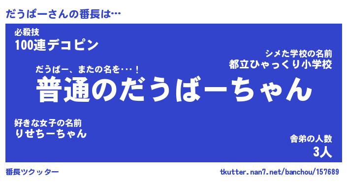 | 意味不明あだ名 | 『ペロリンだうばー』『永久保存だうばー』 |