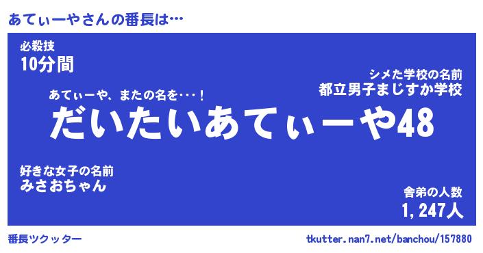 | 伝説のあだ名 | 『不死鳥のスナイパーあてぃーや』 |