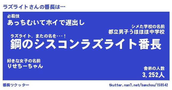 | 伝説のあだ名 | 『封印されしスナイパーラズライト』 |