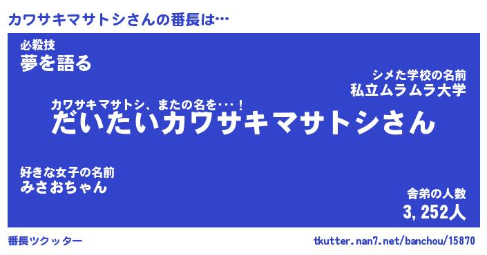 | ヒーロー風カッコイイあだ名 | 『スーパーカワサキマサトシ』 |