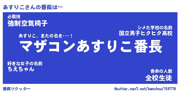 | 伝説のあだ名 | 『封印されしスナイパーあすりこ』 |