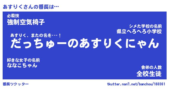 | 意味不明あだ名 | 『ペロリンあすりく』『永久保存あすりく』 |