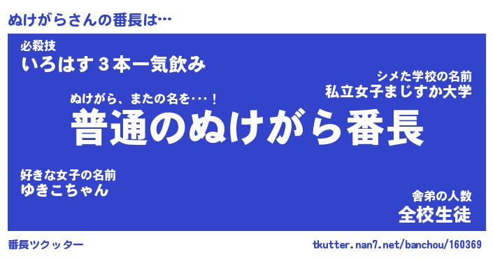 | ヘコむあだ名 | 『ぬけにゅー』『なまこ酢』 |