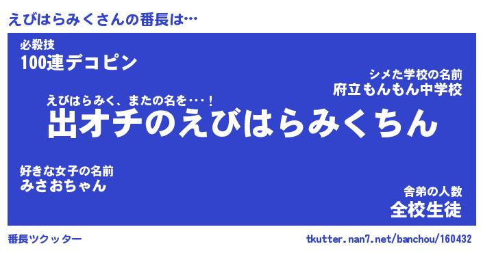 | ヒーロー風カッコイイあだ名 | 『スーパーエビハラミク』『黄金騎士エビ』 |