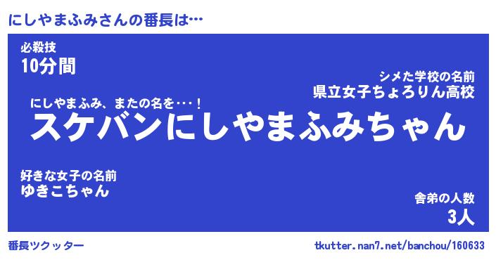 | ファンタジー風あだ名 | 『ニシフェル』『ファントムニシス』 |