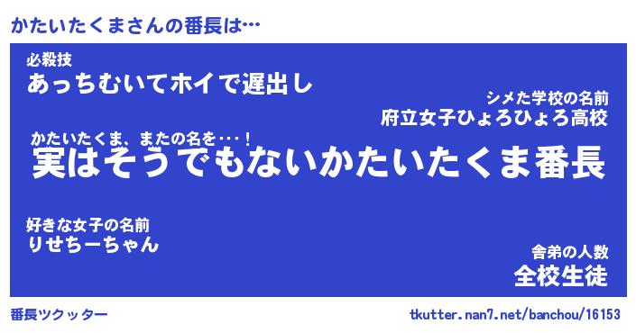 | ヒーロー風カッコイイあだ名 | 『スーパーカタイタクマ』『天弓騎士カタ』 |