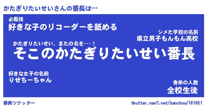| 肩書あだ名 | 『かたぎりたいせい店長』 |