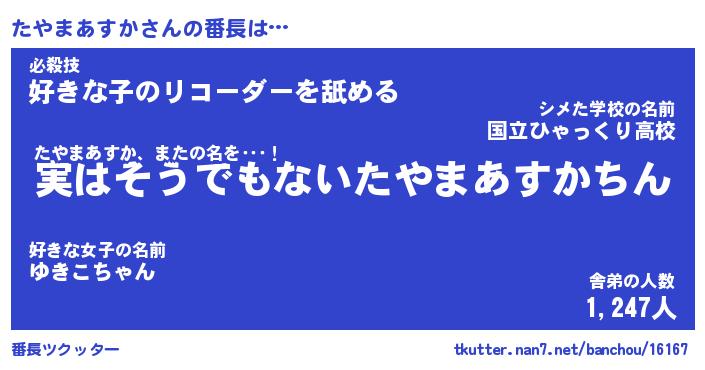 | ヘコむあだ名 | 『たやにー』『なまこ酢』『たやっぺ』 |