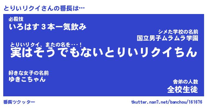 | 伝説のあだ名 | 『封印されしスナイパーとりいリクイ』 |