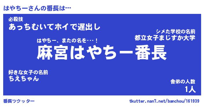 | 意味不明あだ名 | 『ペロリンはやちー』『永久保存はやちー』 |