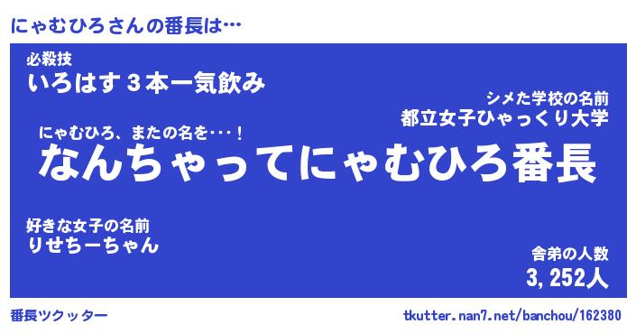 | 男性向けラノベタイトル風あだ名 | 『にゃむひろの憂鬱』 |