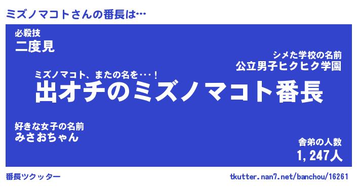 | ヒーロー風カッコイイあだ名 | 『スーパーミズノマコト』『天弓騎士ミズ』 |