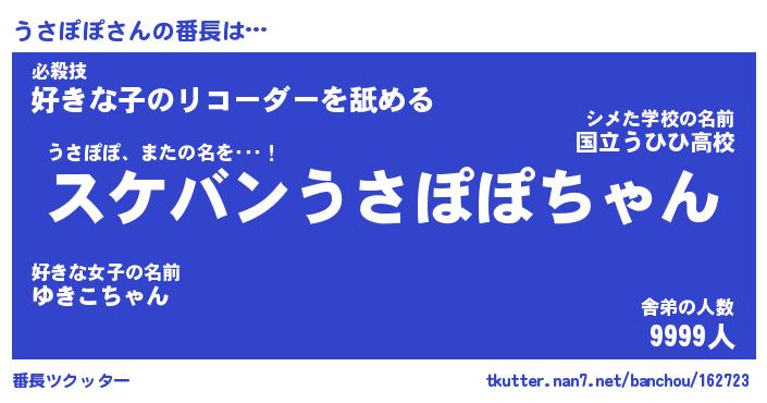 | 意味不明あだ名 | 『ペロリンうさぽぽ』『永久保存うさぽぽ』 |