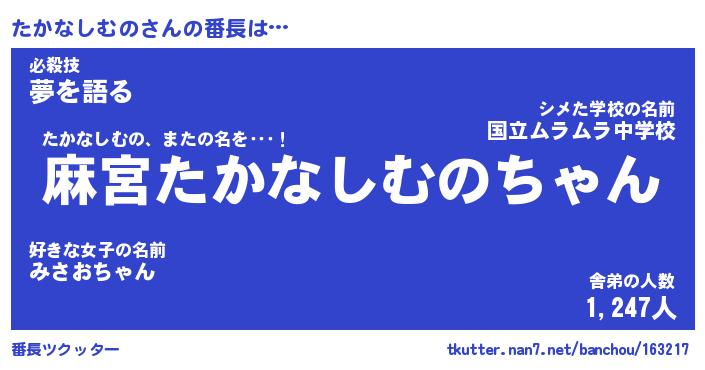 | 伝説のあだ名 | 『不死鳥のスナイパーたかなしむの』 |