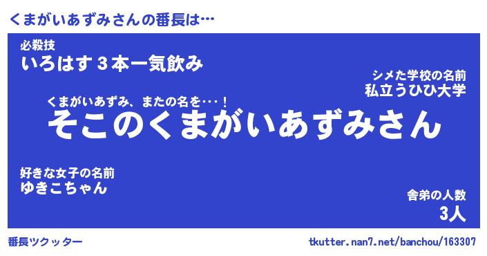 | 意味不明あだ名 | 『ペロリンくまがいあずみ』 |