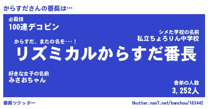| 意味不明あだ名 | 『ペロリンからすだ』『永久保存からすだ』 |