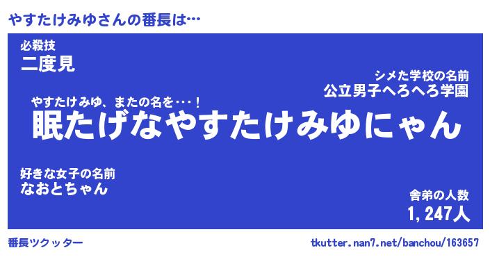| 伝説のあだ名 | 『封印されしスナイパーやすたけみゆ』 |