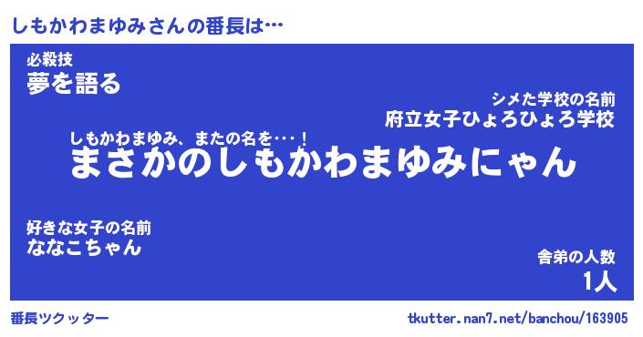 | 女子向けラノベタイトル風あだ名 | 『(仮)しもかわまゆみのやんごとなき事情』 |