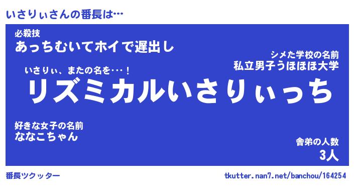 | 意味不明あだ名 | 『ペロリンいさりぃ』『永久保存いさりぃ』 |