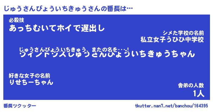 | ヘコむあだ名 | 『じゅにゅー』『つくし』『じゅお』 |