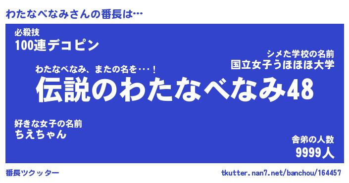 | 猫の名前『わたなべなみにゃん』性別『雌』 |