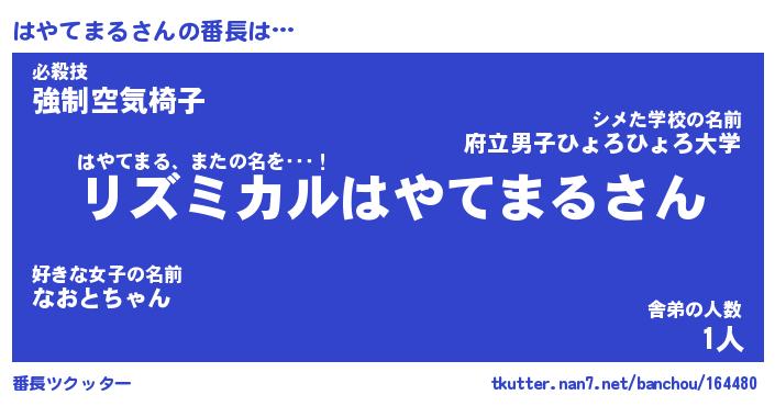 | 肩書あだ名 | 『はやてまる社長』『はやてまる総理大臣』 |