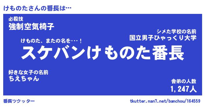 | ヒーロー風カッコイイあだ名 | 『スーパーケモノタ』『天弓騎士ケモ』 |