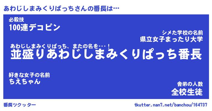 | 伝説のあだ名 | 『不死鳥のスナイパーあわじしまみくりぱっち』 |