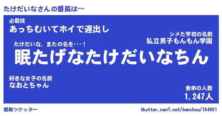 | 肩書あだ名 | 『たけだいな店長』『たけだいな大統領』 |