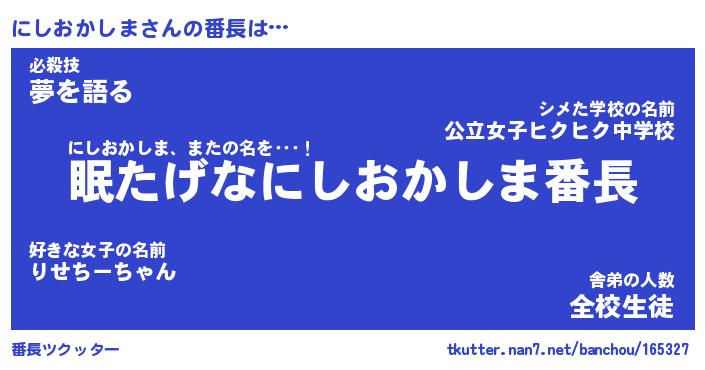 | 肩書あだ名 | 『にしおかしま社長』『にしおかしま担任』 |