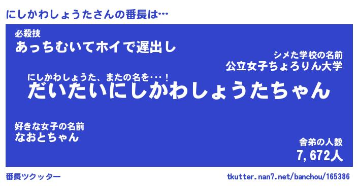 | 男性向けラノベタイトル風あだ名 | 『にしかわしょうたの憂鬱』 |